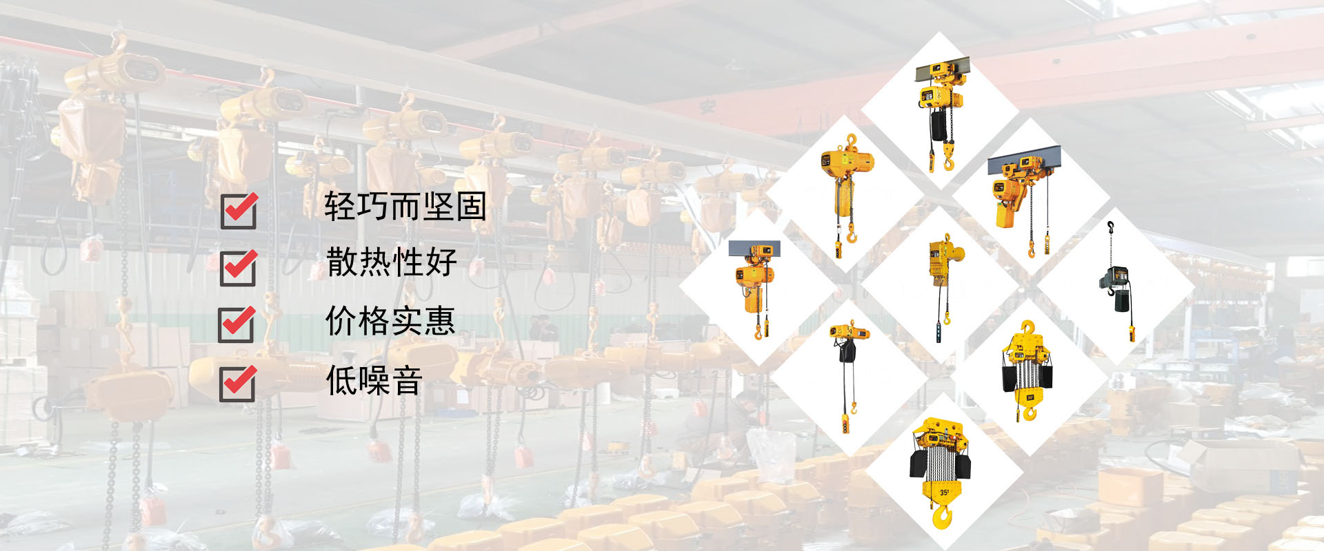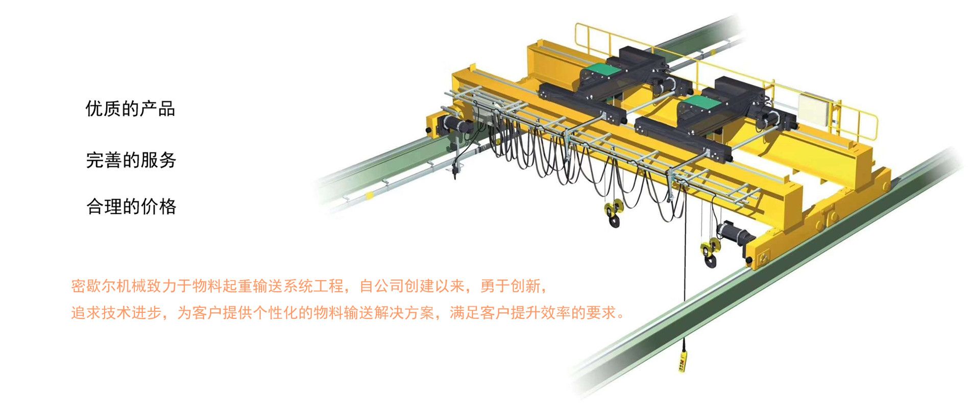 密歇爾起重機(jī)械(杭州)有限公司提供全面的起重輸送產(chǎn)品和服務(wù),產(chǎn)品覆蓋環(huán)鏈電動(dòng)葫蘆(125Kg-80T),歐式鋼絲繩葫蘆,防爆葫蘆,懸臂吊,KBK柔性起重機(jī),歐式起重機(jī),起重馬達(dá),端梁,起重移動(dòng)供電系統(tǒng)等,在國(guó)內(nèi)外被廣泛的應(yīng)用于生產(chǎn)車(chē)間,汽車(chē),模具,機(jī)械制造,鐵路,船舶,物流搬運(yùn),現(xiàn)代化工廠流水線(xiàn)等工業(yè)及其它特殊用途。
